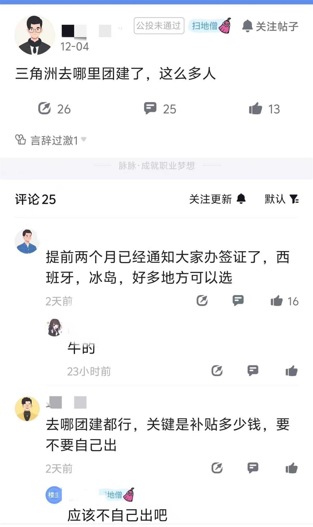 据网友发帖,鹅厂IEG三角洲团队通知将举办高规格团建,团队内员工在之前已被通知要求办理签证。本次团建有冰岛、新西兰等地可选。不少网友在评论区表示十分羡慕。“上班上着上着心碎了”“太爽了”“不愧是大厂”,还有网友评论:“还得是腾讯,俞敏洪自己去南极,还得发好几篇小作文。”