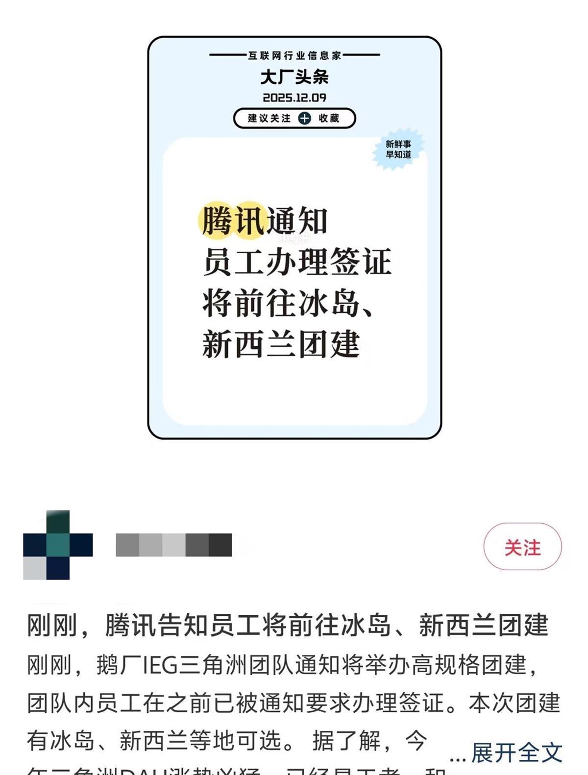12月9日下午,有网友发帖称“鹅厂(腾讯的昵称)”IEG三角洲团队通知举办高规格团建,有冰岛、新西兰等地可选,此事引发网友热议,不少网友表示十分羡慕。当日下午,腾讯一名员工向极目新闻记者证实IEG三角洲团队确有团建出国旅游的情况,上周已有团队成员前往冰岛旅游。
